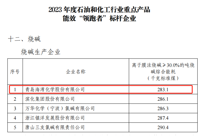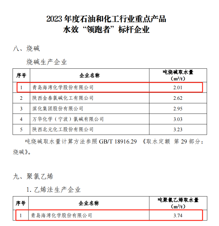 其中,海湾化学离子膜法烧碱≥30.0%的吨烧碱综合能耗为283.1kgce/t,较去年减少3.69kgce/t,连续四年稳居榜首。同时,企业以2.01m³/t的吨烧碱取水量和3.74m³/t的吨聚氯乙烯取水量,首次将烧碱生产企业和乙烯法生产企业的水效“领跑者”第一名收入囊中。