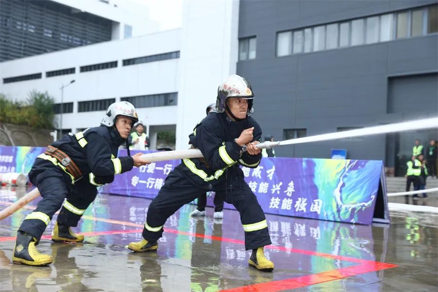 应急救援竞赛项目由专业理论知识竞赛项目、应急救援技能实操竞赛项目两部分组成。其中,技能实操竞赛设置双人水带射水打靶、涉险区伤员转运、带压快速堵漏三个比赛项目,理论和实操权重占比为3:7,共有22支队伍44人参加比赛。