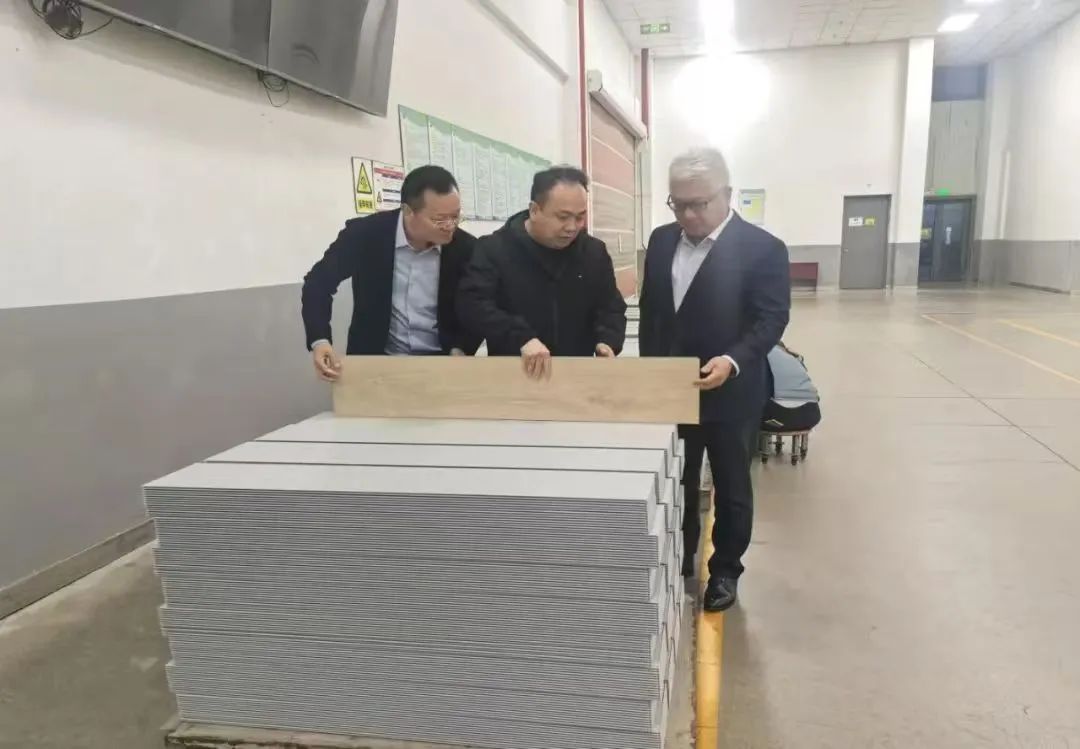 参观客户企业产品展厅、生产现场是此行调研的主要议程。在爱丽家居科技股份有限公司生产现场,李明一行认真察看了2条PVC压延线、21条拉板线运转情况,详细了解PVC地板基层、耐磨层生产流程,并就销售模式、包装等方面向客户企业征求意见,客户企业结合使用体验提出优化建议。