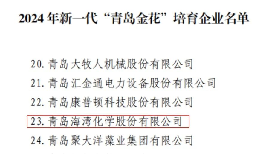 1月2日,青岛市工信局等三部门联合公布2024年新一代“青岛金花”培育企业名单,确定43家制造业企业、30家服务业企业、36家农业企业为2024年新一代“青岛金花”培育企业,海湾化学再次入选。这是企业第五次荣登榜单。