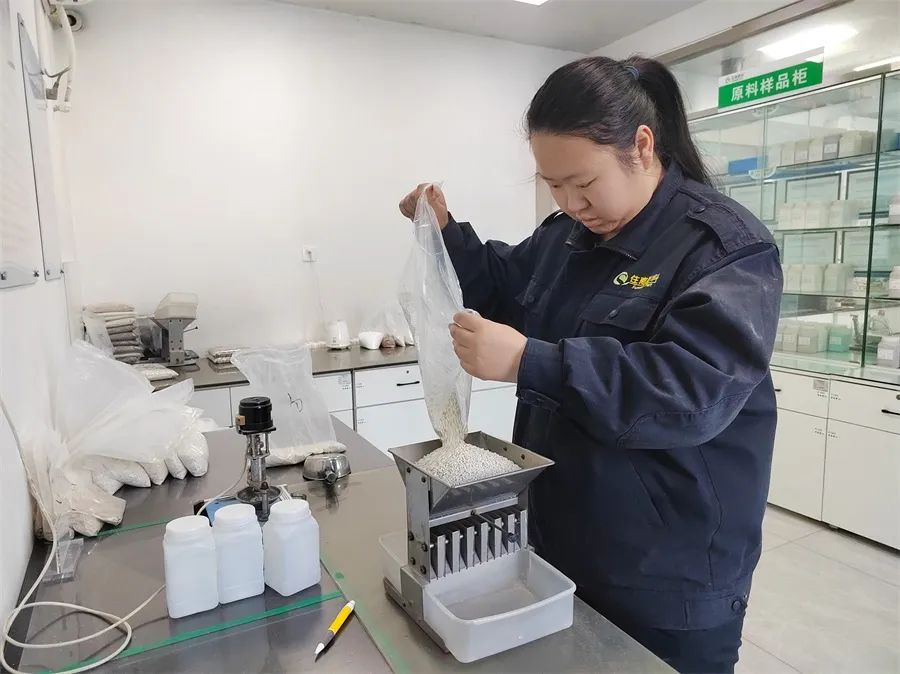 碱业发展住商肥料(青岛)公司品管部职工取样混样等待检测。李美佳 摄