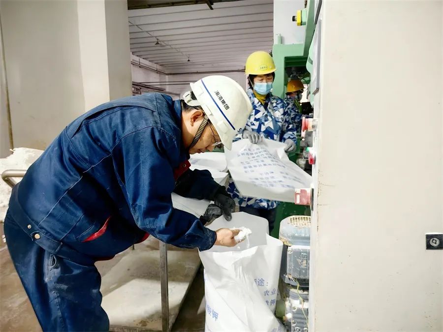 碱业发展硫酸钾厂职工正在对产品质量进行检查。罗兆麟 摄