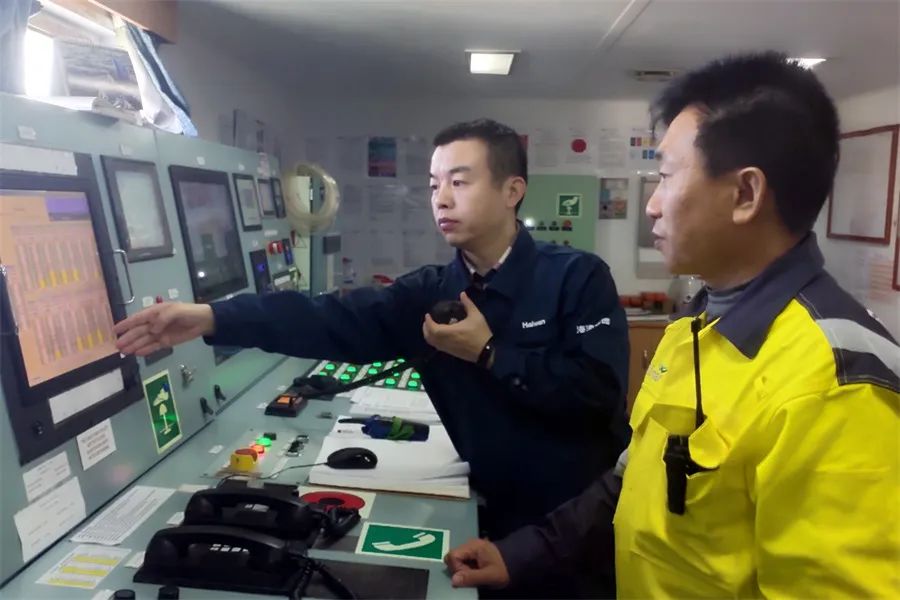 海湾港务运行三班驻船调度正在和船方大副一起进行船岸联检。潘洋洋 摄
