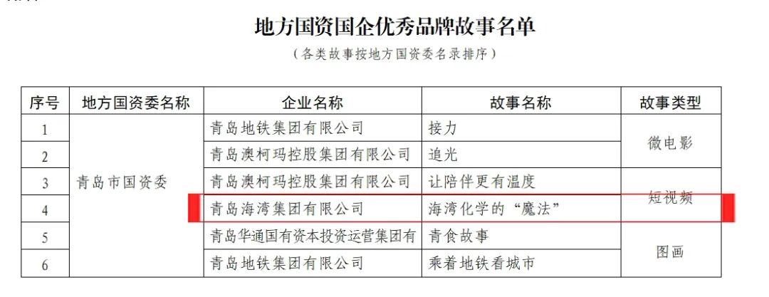近日,国务院国资委发布2024年国有企业优秀品牌故事名单,青岛市直企业6个品牌故事成功入选,海湾集团提报的短视频《海湾化学的“魔法”》位列其中。这是集团继2021年以微电影《我和我们的故事刚刚开始》成功入选国务院国资委优秀品牌故事之后第二次获此殊荣。