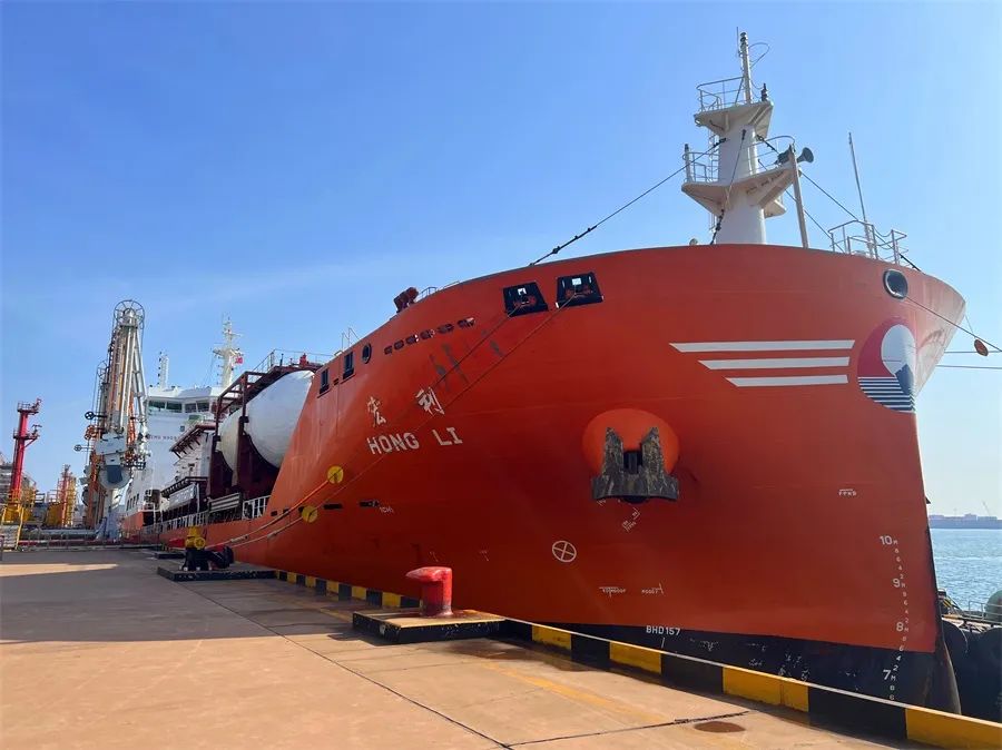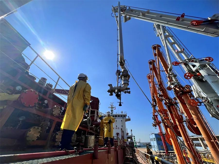 船员与码头工人默契配合,缆绳稳稳地固定在系缆桩上,输料臂缓缓伸展,精准对接船舱输料口。对讲机里传来调度员的指令:“HW1#泊位船舶已靠泊,准备接卸作业,请各岗位人员就位······”在HW2#泊位,高耸的输料臂正将乙烯源源不断地输送到后方园区储罐中……