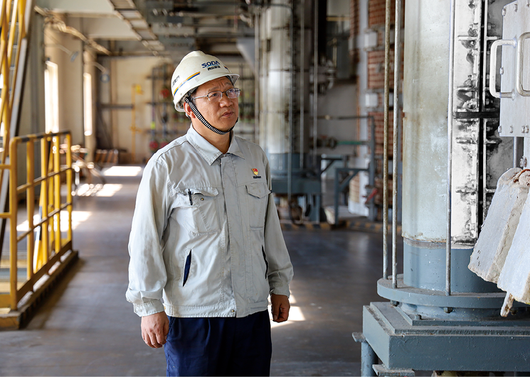 而在面对项目碱蒸发装置产生碱蒸汽冷凝液的问题时,他凭借钻研与经验,创新性地提出将冷凝液用作电解槽循环碱加脱盐水,这项技改实施后,节约了脱盐水48m3/h及大量蒸汽,每年可为企业节约1000余万元费用。