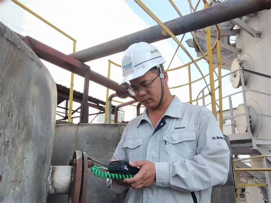 海湾精化染料二厂员工在风送物料前检查气密性。呼扬春晖 摄