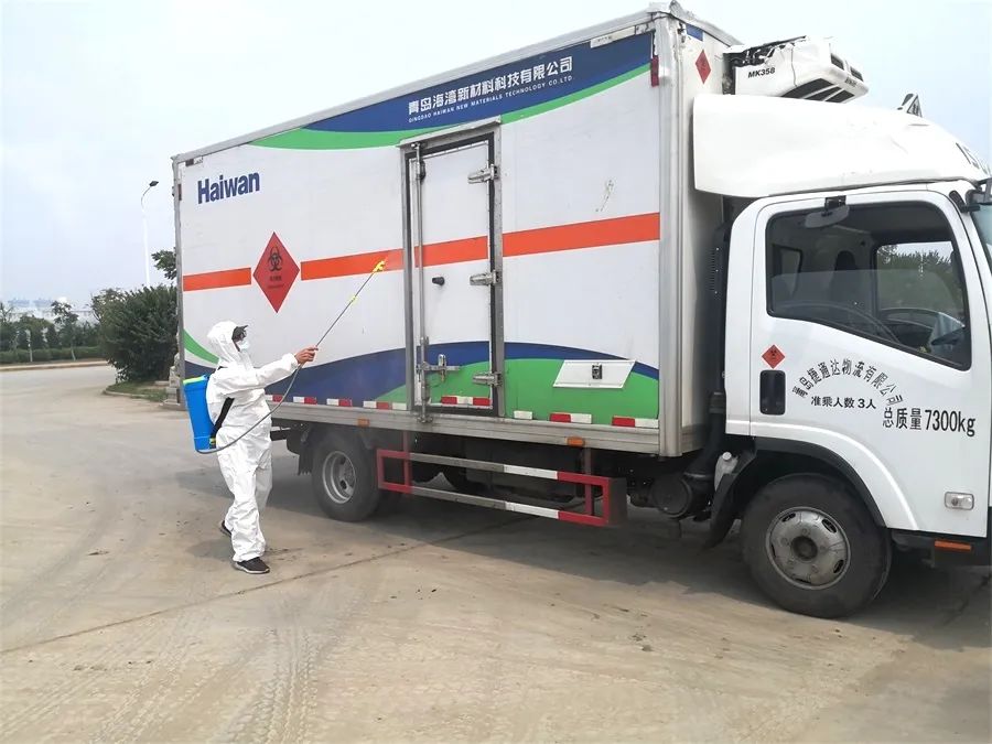 海湾新材料员工对医废运输车辆进行消毒